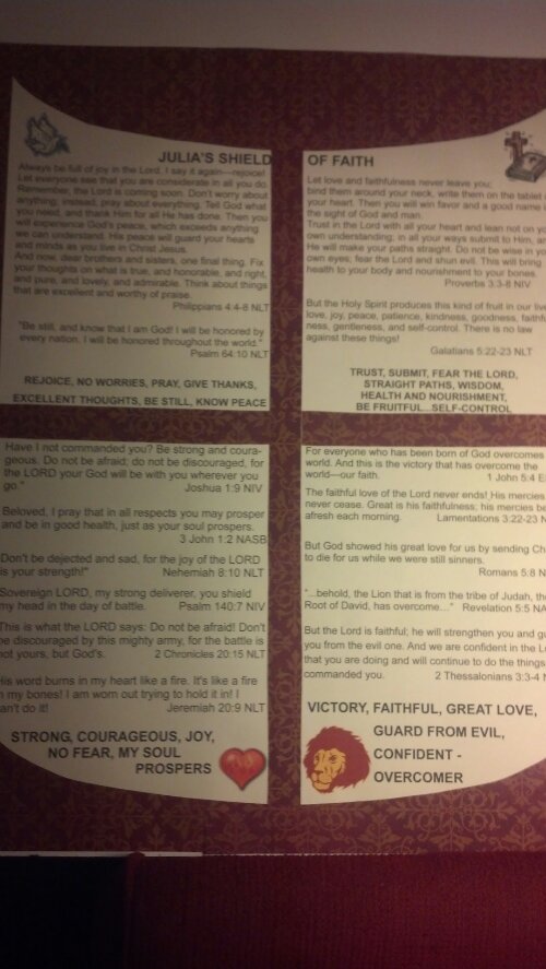 In our Proverbs 31 Online Bible Study of Made to Crave Action Plan we have an assignment/challenge to make a shield with verses we can use to protect ourselves from the fiery darts the enemy throw a at us. Here’s mine. I printed it on card stock, backed it with scrapbook paper and used scraps of the scrapbook paper to make the dividing lines on the shield. Then I backed it with more card stock to make is sturdier.