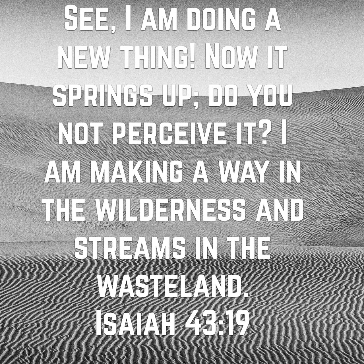 The verse in the image, Isaiah 43:19, has been popping up a lot this last week in a variety of places. I believe God is saying to me, “It is time! Get moving! I have prepared you to do this. I go before you and prepare the way. Walk in it!”